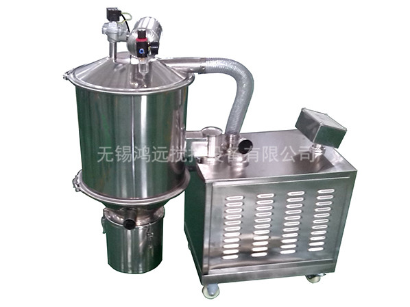 真空上料機(jī)中裝有壓縮空氣反吹裝置,每次放料時(shí),壓縮空氣脈沖反吹過濾器,把吸附于過濾器表面的粉末打落下來,以保證吸料能正常運(yùn)行。