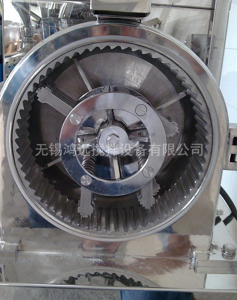 該機(jī)由加料斗,分級(jí)輪,粉碎刀片,齒圈,粉碎電機(jī),出料口,風(fēng)葉,集料箱,吸塵箱等部分組成,物料由加料斗進(jìn)入粉碎室,通過(guò)高速旋轉(zhuǎn)的刀片進(jìn)行粉碎,調(diào)節(jié)分級(jí)輪與分級(jí)盤的距離來(lái)達(dá)到所要求的物料細(xì)度,高速旋轉(zhuǎn)的風(fēng)葉把達(dá)到要求的物料從粉碎室引到集料箱布袋中,沒(méi)有達(dá)到要求的物料繼續(xù)在粉碎室中粉碎,集料箱布袋產(chǎn)生的粉塵由吸塵箱收集,該機(jī)組按“GMP”標(biāo)準(zhǔn)設(shè)計(jì),結(jié)構(gòu)簡(jiǎn)單,操作清理方便,噪音小,產(chǎn)量高,機(jī)器采用不銹鋼材料制作,粉碎過(guò)程中無(wú)粉塵飛揚(yáng)。